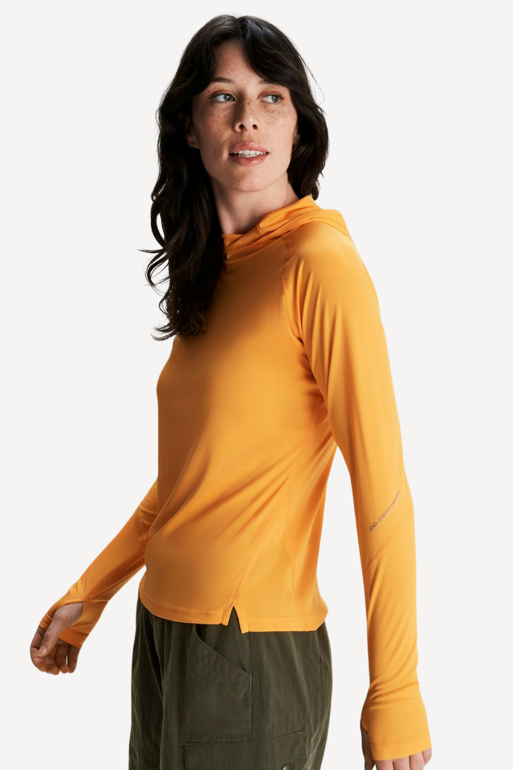 T-shirt anti-UV orange UPF 50+ pour femme, léger et élégant, idéal pour les activités de plein air.