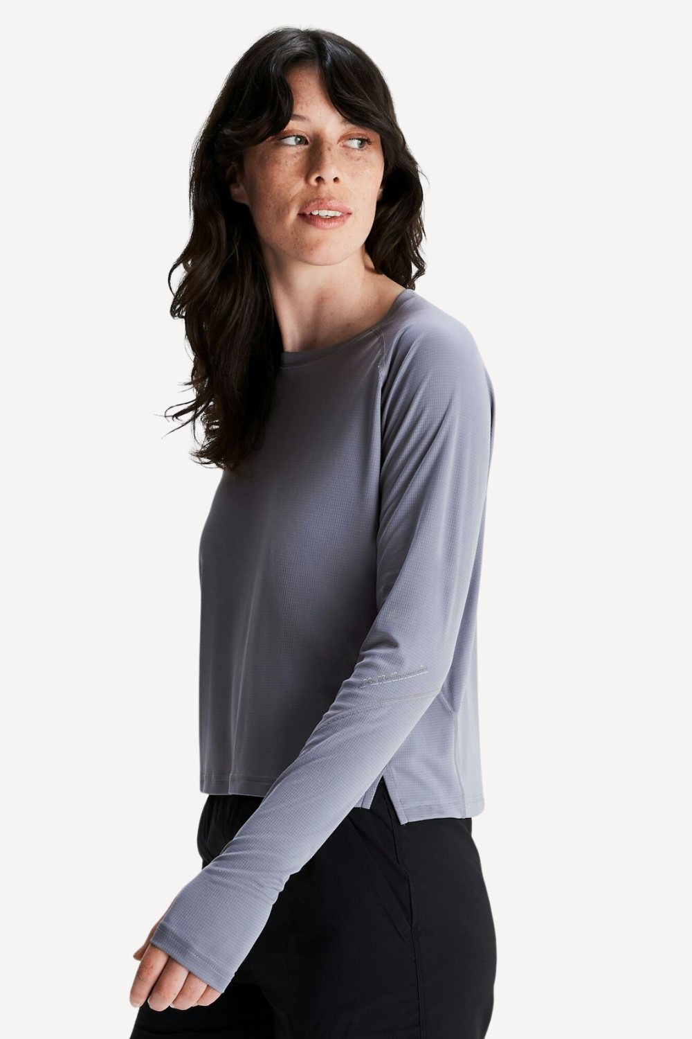 T-shirt anti-UV beige à manches longues pour femme, léger et confortable, certifié UPF 50+ pour une protection solaire efficace.
