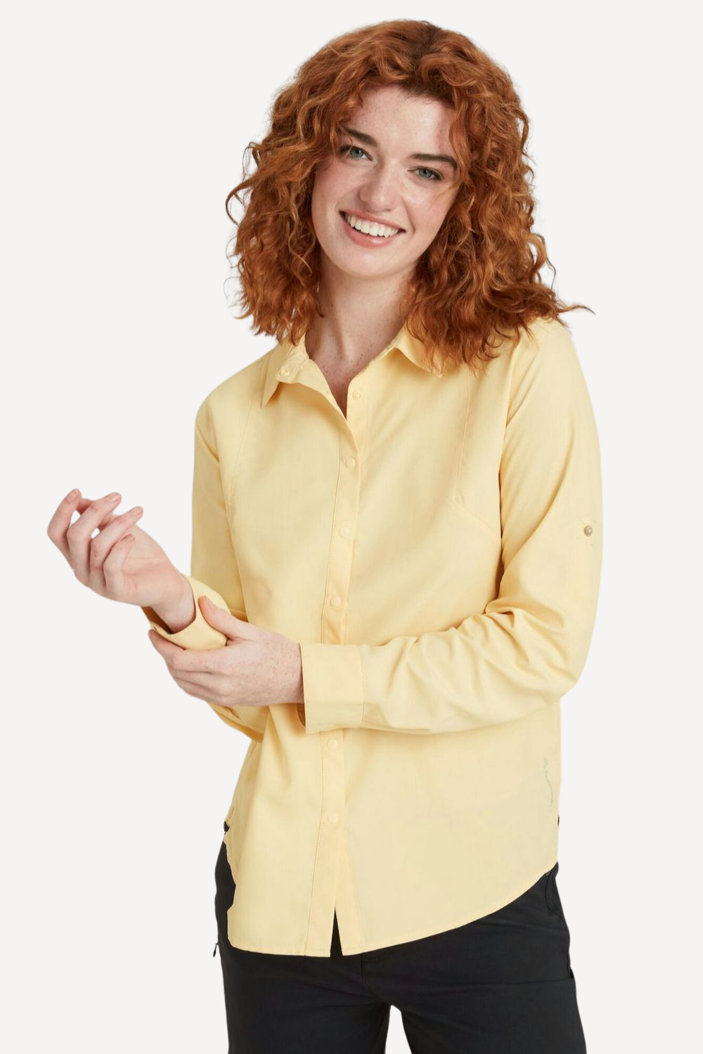 Chemise anti-UV blanche UPF50+ pour femme, légère et élégante, parfaite pour les aventures en plein air.