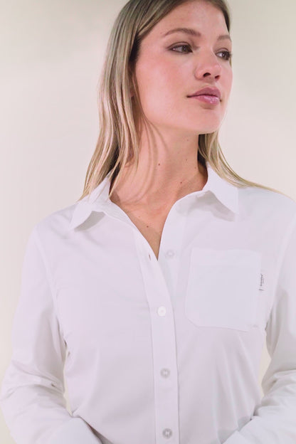 Notre chemise anti-UV femme, dans son coloris Blanc, allie protection solaire efficace et élégance décontractée, ajoutant une touche lumineuse à vos journées en plein air.