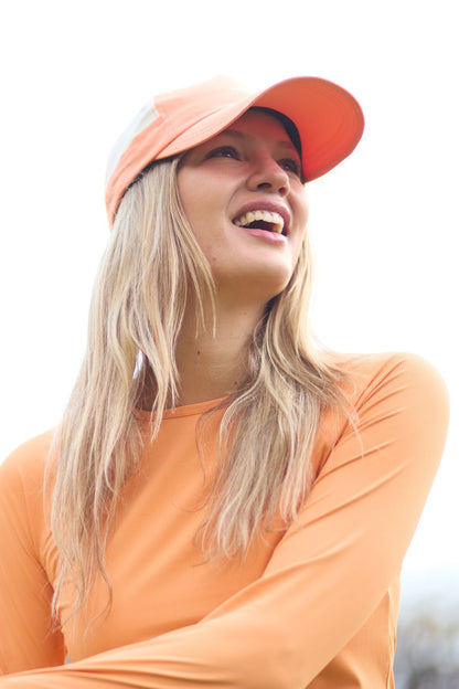 Notre casquette anti-UV femme, dans sa jolie teinte bicolore Blanc Perlé & Sorbet Abricot, est l'accessoire anti-UV idéal pour toutes vos activités de plein air.